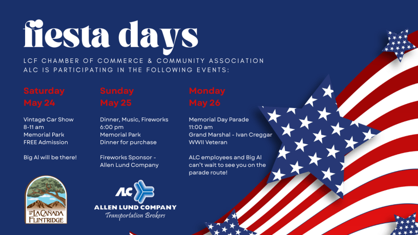Allen Lund Company is thrilled to join the La Cañada Flintridge Chamber of Commerce in celebrating Fiesta Days 2025, a beloved Memorial Day weekend tradition packed with community fun and patriotic spirit. From a French Toast Breakfast and vintage car show to the iconic Memorial Day Parade and lively concerts in the park, there’s something for everyone to enjoy.